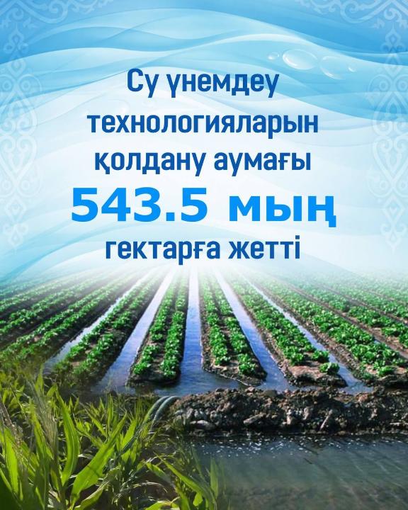 Су үнемдеу технологияларын қолдану аумағы 543,5 мың гектарға жетті. Осылайша, Мемлекет басшысының жыл сайын шамамен 150 мың гектар жаңа алқапта су үнемдеу жүйелерін енгізу жөніндегі тапсырмасы орындалып жатыр.