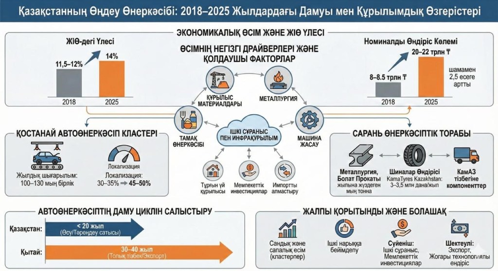 Бұл саясат нақты нәтижелермен бекіді. 2018–2025 жылдар аралығында өңдеу өнеркәсібі Қазақстан экономикасындағы ең серпінді әрі жүйелік маңызы бар сегменттердің біріне айналды. Осы кезеңде оның ЖІӨ-дегі үлесі шамамен 11,5–12%-дан 14%-ға дейін ұлғайып, экономикалық өсімнің негізгі тіректерінің біріне айналды. Номиналды өндіріс көлемі 8–8,5 трлн теңгеден 20–22 трлн теңгеге дейін өсіп, шамамен 2,5 есеге артты, бұл сектордың қарқынды кеңеюін көрсетеді.