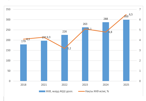 2025 жыл Қазақстан үшін экономикалық дамуда сапалық бетбұрыс кезеңі болды. Номиналды жалпы ішкі өнім шамамен 300 млрд АҚШ долларына жетті, ал нақты экономикалық өсім 6,5% деңгейінде қалыптасты. Бұл көрсеткіш дағдарысқа дейінгі жылдардан да, 2021–2023 жылдардағы қалпына келтіру өсімінен де жоғары болып, 2018–2025 жылдар аралығындағы ең күшті өсім жылы ретінде ерекшеленді.