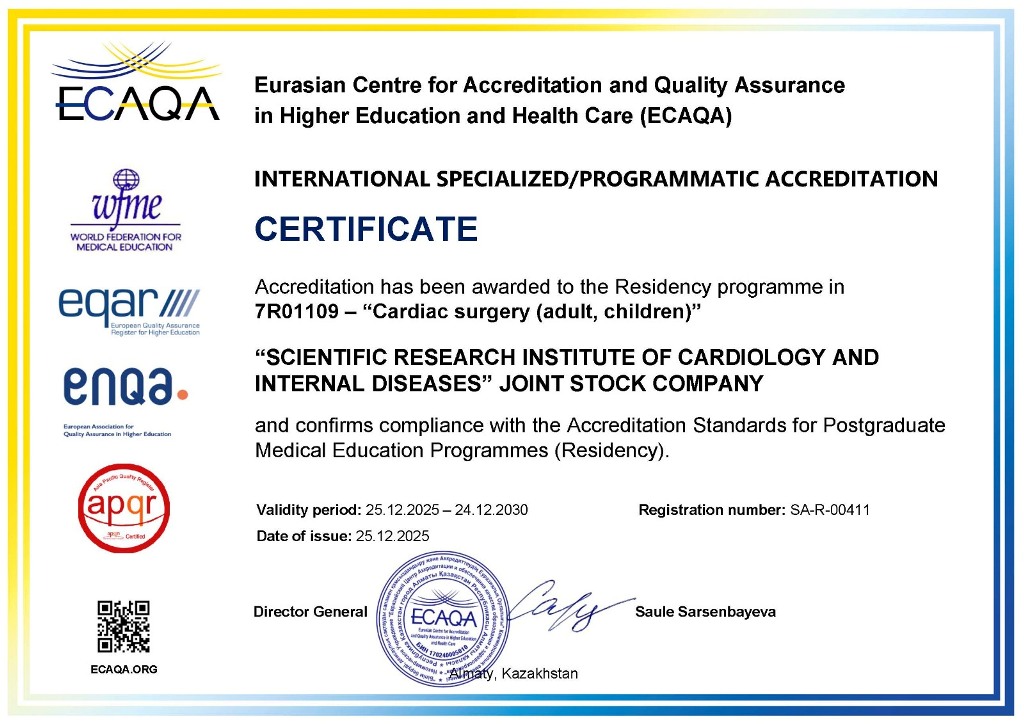 Кардиология және ішкі аурулар ғылыми-зерттеу институты «Кардиохирургия (ересектер, балалар)» мамандығы бойынша резидентура бағдарламасының халықаралық аккредиттеуден өтті, деп хабарлайды DKNews.kz.