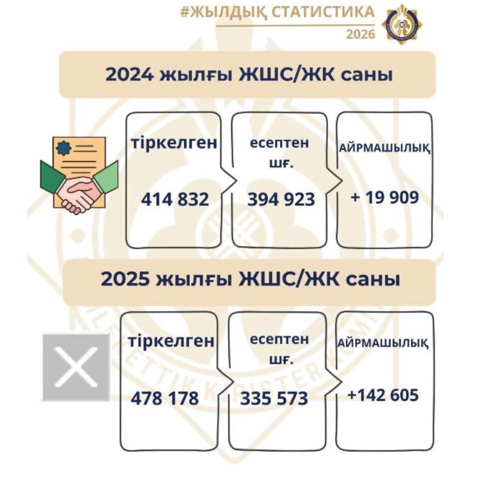 Нақты серпіліс 2025 жылы байқалды. Заңды тұлғалар мен жеке кәсіпкерлер саны 478 мыңға жетіп, өткен жылмен салыстырғанда айтарлықтай артты. Ал есептен шығарылған субъектілер саны 335 мың болды — бұл 2024 жылдағы көрсеткіштен едәуір төмен.