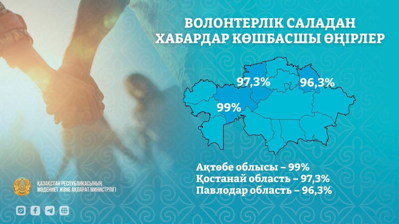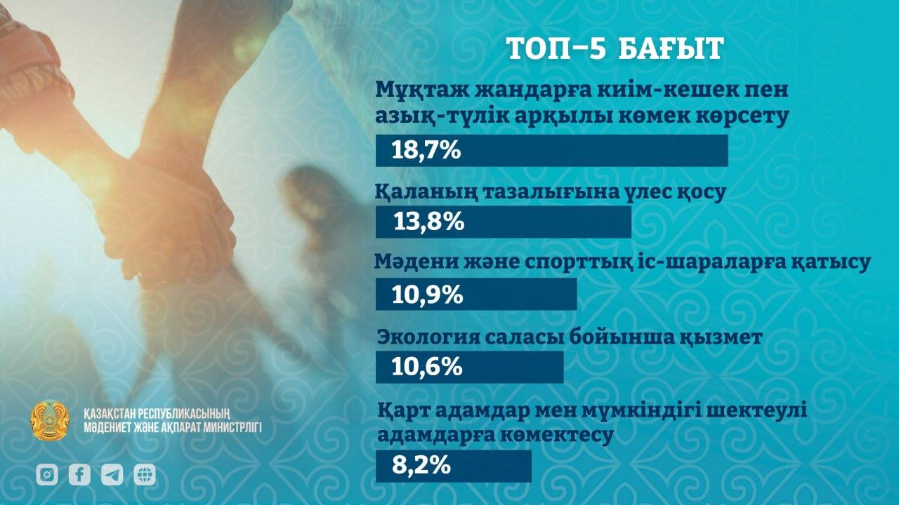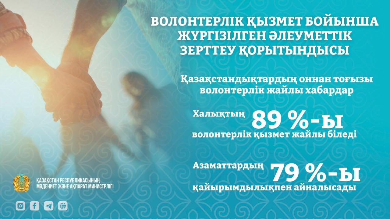 Зерттеу қорытындысы бойынша, Қазақстанда волонтерлік қызмет тұрақты түрде дамып келеді. Қазіргі кезде волонтерлер саны 300 мыңнан асып, іске асырылған жобалар бес есе артқан. Сауалнама нәтижесі халықтың 89 %-ы волонтерлік қызмет туралы білетінін және әрбір үшінші азаматтың волонтерлік бастамаларға белсенді түрде қатысатынын айқындады.