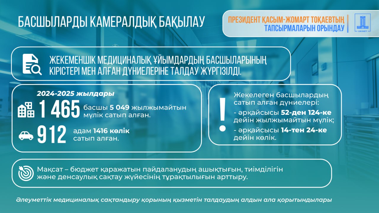 Нәтижесінде 2024-2025 жылдары 1 465 басшының 5 мыңнан астам жылжымайтын мүлік нысанын, ал 912 адамның 1 416 автокөлік сатып алғаны анықталды. Кейбір жекеменшік клиника басшылары екі жыл ішінде 52-ден 124-ке дейін жылжымайтын мүлік пен 14-тен 24-ке дейін автокөлік иеленген.