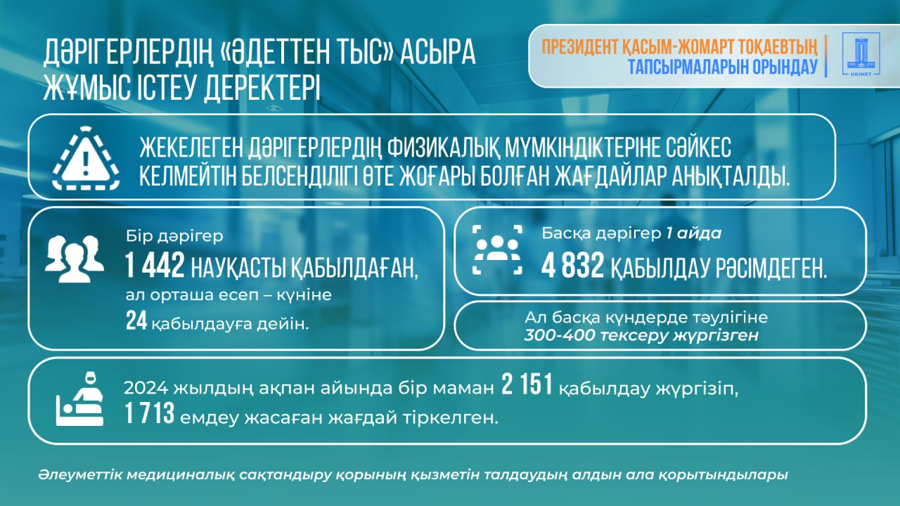 Тағы бір жағдайда бір маманның бір айда 1 713 емдеу жасағаны, ал кей күндері тәулігіне 300-400 тексеру жүргізгені тіркелген.