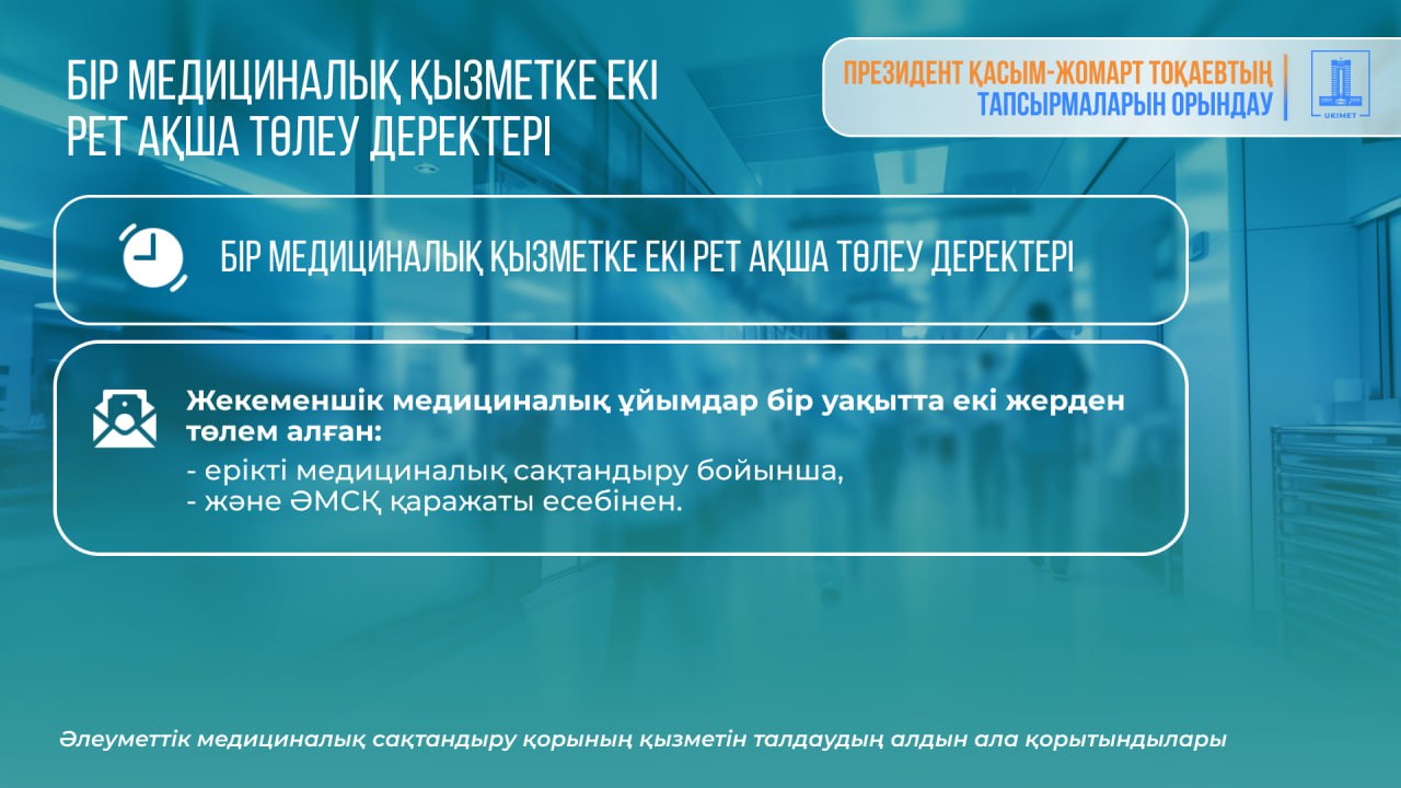 Қаржы министрі Мәди Такиевтің айтуынша, соңғы жылдары медицинаға бөлінетін қаражат айтарлықтай артқанымен, жүйенің тиімділігі сол деңгейде өспеген. 2026 жылы ӘМСҚ арқылы медицинаға бөлінетін шығыстар 2,4 трлн теңгені құрайды. Бұл 2020 жылмен салыстырғанда 1 трлн теңгеге көп.