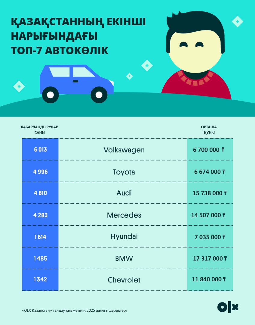 OLX Қазақстан деректеріне сәйкес, 2025 жылы бір хабарландыруға келетін кері байланыс саны брендке, бағаға және өңірге байланысты қатты өзгерді. 8 млн теңгеге дейінгі жаппай брендтер қысқа уақытта 5–10 кері байланыс жинай алса, премиум модельдер кейде апталап назарсыз қалды.