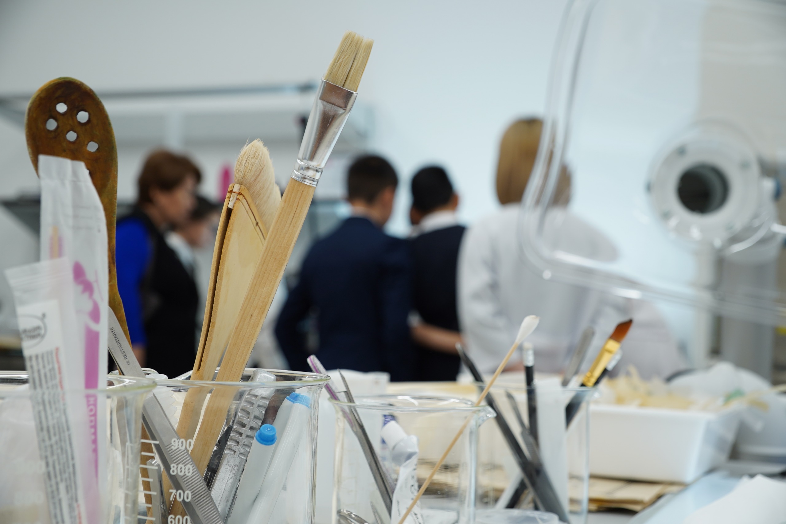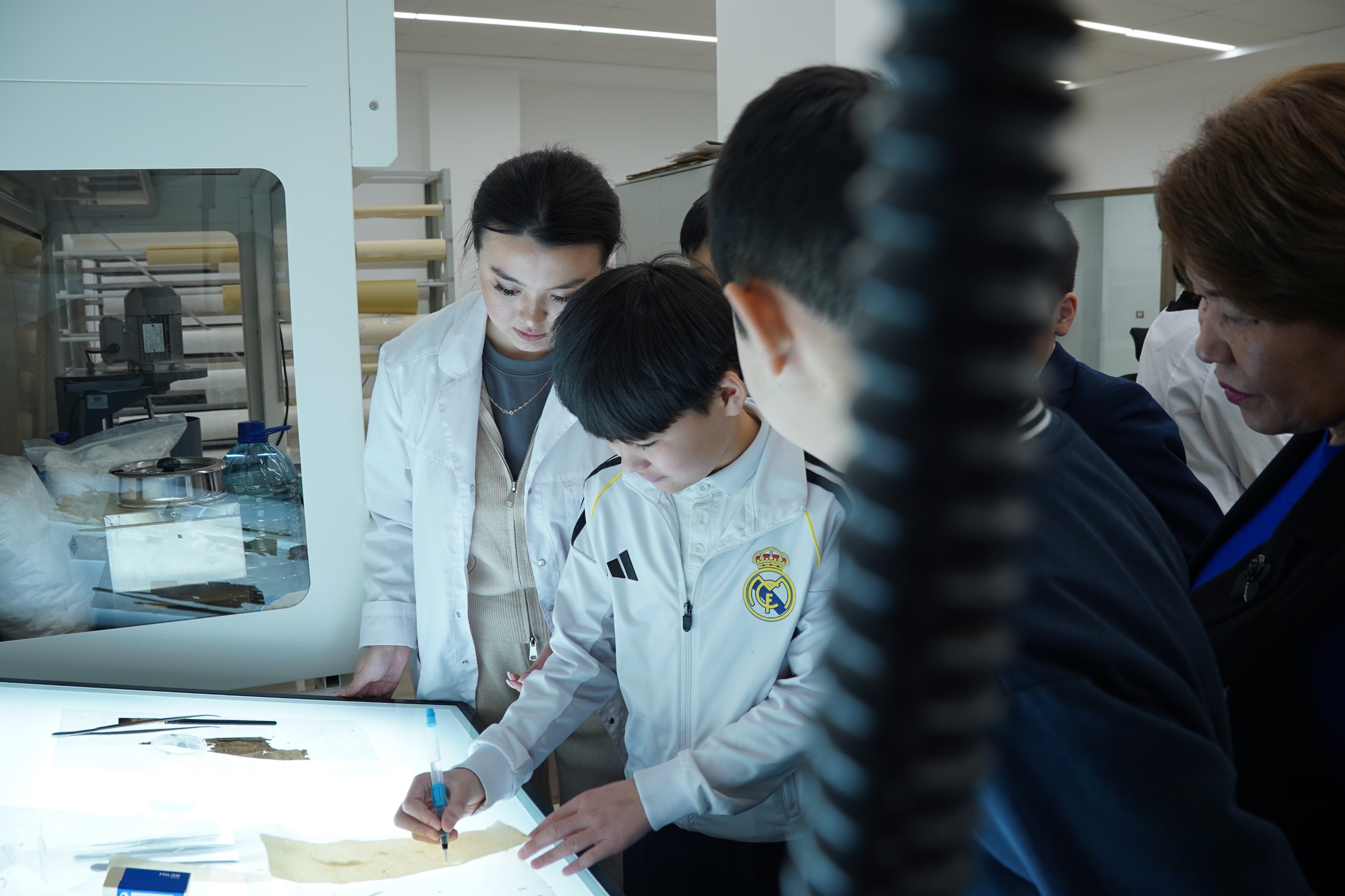 Екінші топ Сақтауды қамтамасыз ету және мемлекеттік есепке алу қызметінің архившісі Айтолқын Аскербекпен бірге құжаттарды қалпына келтіру процесімен танысты. Оқушылар: