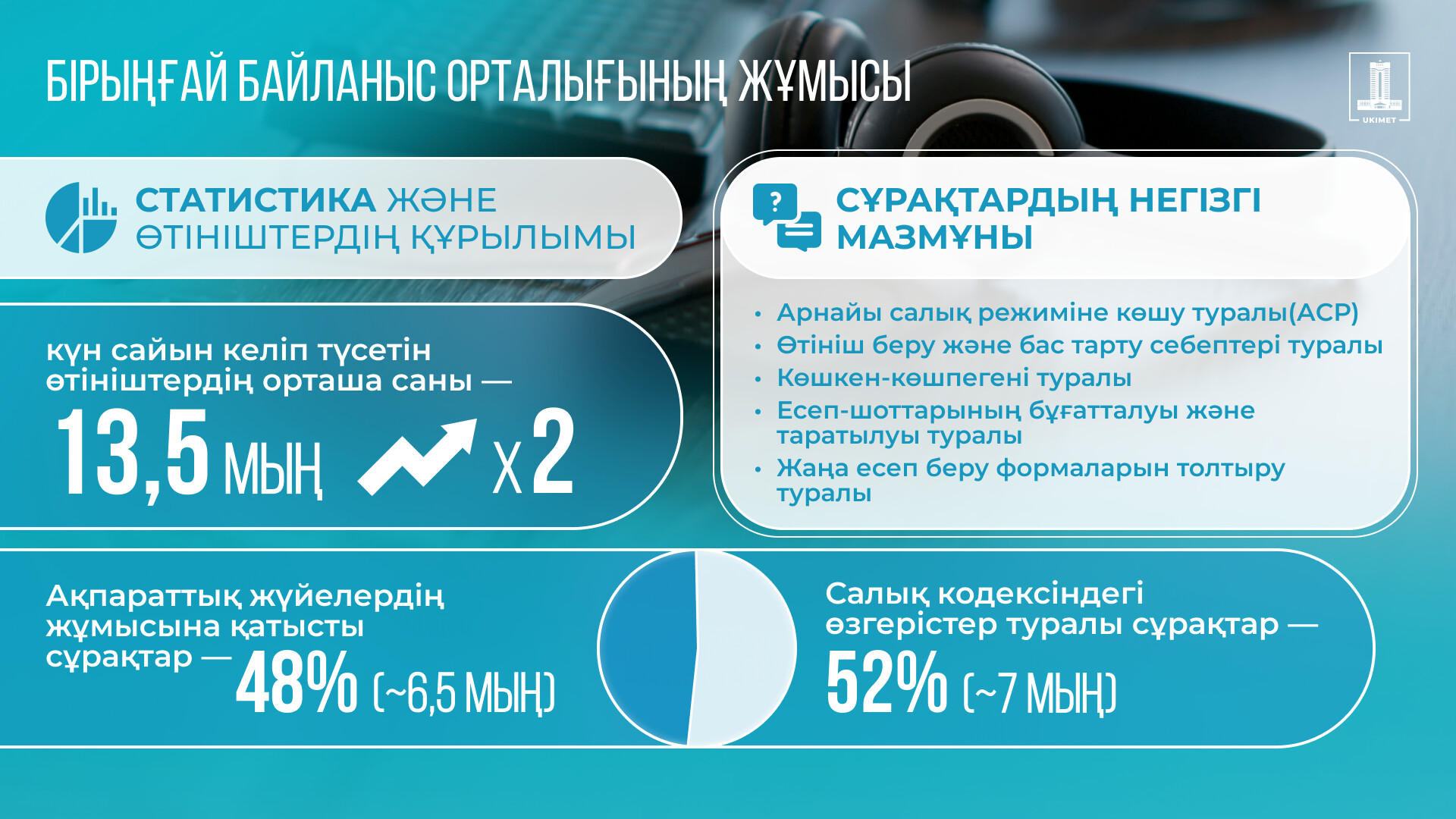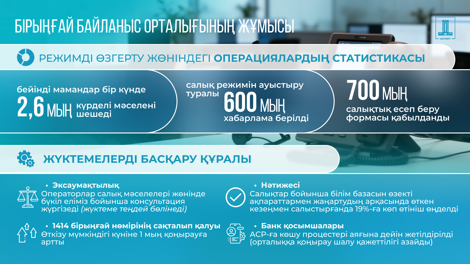Күн сайын операторлар 13–14 мың өтініш қабылдайды. Соның 7 мыңға жуығы салық реформасы, әлеуметтік төлемдер және өзге де маңызды мәселелерге қатысты. Егер сұрақ жүйелі сипат алса, ол тиісті бөлімшелерге жолданып, талданып, шешім қабылданады.
