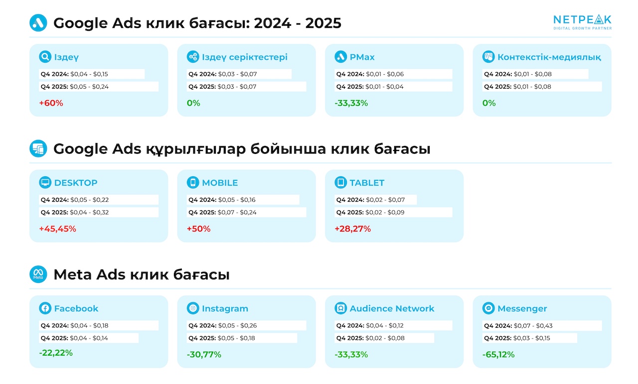 Қазақстанда жарнама аукциондары «салқындап» қалды. 2025 жылдың IV тоқсанында Google Ads-та медианалық клик бағасы шамамен 20%-ға төмендеді, ал Meta экожүйесінде күтпеген сенсация болды - Threads бірнеше есе арзандап, бұрынғы «қымбат» статусынан бір сәтте айырылды. Netpeak Kazakhstan мамандары 16 өңір бойынша 2 миллионнан астам клик деректерін талдап, бизнеске нарықтық бағдар беретін көрсеткіштерді жинақтады, деп хабарлайды DKNews.kz.