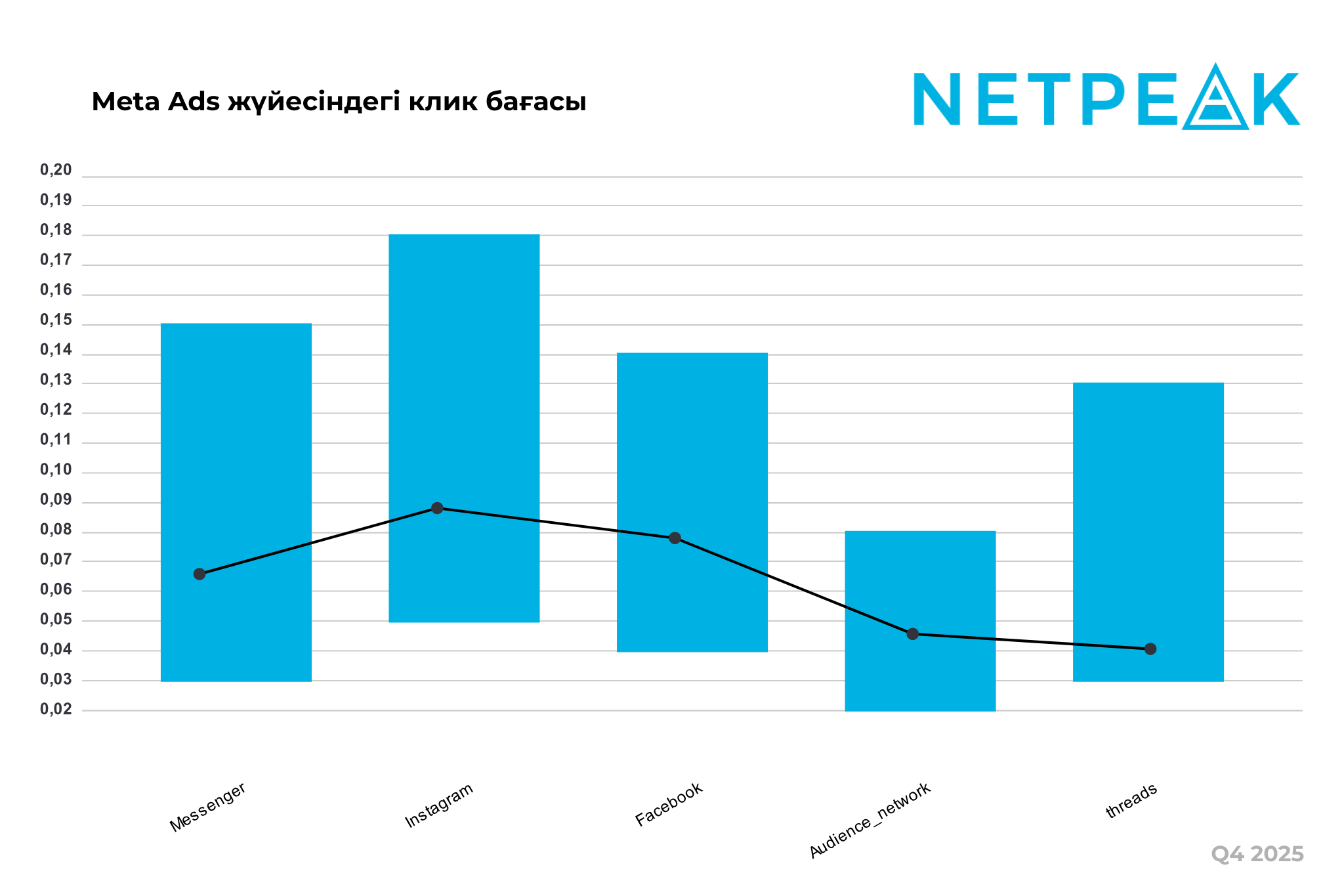Facebook медианасы $0,08 деңгейіне қайта келді, жоғарғы квартиль $0,14-ке дейін қысқарды. Бұл платформа баға мен қамтудың балансын ұстап тұрған «алтын орта» күйінде қалды.