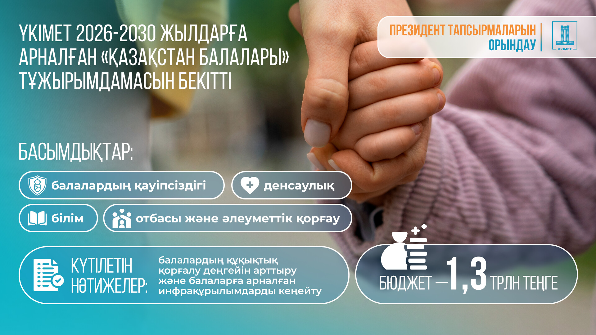 «Мемлекет басшысы Ұлттық құрылтайда “Қазақстан балалары” бірыңғай тұжырымдамасын әзірлеуді тапсырды. Балаларға жан-жақты қамқорлық жасау – мемлекеттің басты басымдықтарының бірі. Бұл құжатта білім беру, денсаулық сақтау, қауіпсіздік, әлеуметтік қамсыздандыру және отбасының әл-ауқаты саласында нақты іс-шаралар жоспары бар», – деді Олжас Бектенов.