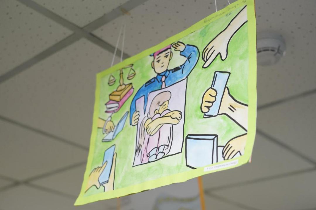 Оқушылар өздерінің заң, құқық тұрғысындағы ойын сурет арқылы сипаттаған. Мысалы, Өміржан Әлинұр салған суретте полиция қызметкерлерінің балаларды қорғайтыны жайлы бейнеленген.