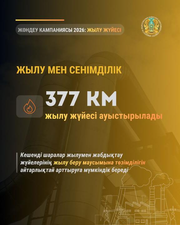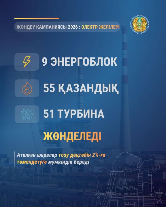 2026 жылы электр станцияларында 9 энергоблокқа, 55 қазандыққа және 51 турбинаға жөндеу жүргізу жоспарланып отыр. Электр желілерінде 17,1 мың шақырым желі мен 444 қосалқы станцияны жаңғырту көзделген, ал жылу желілерінде 377 шақырымды ауыстыру жоспарланған.