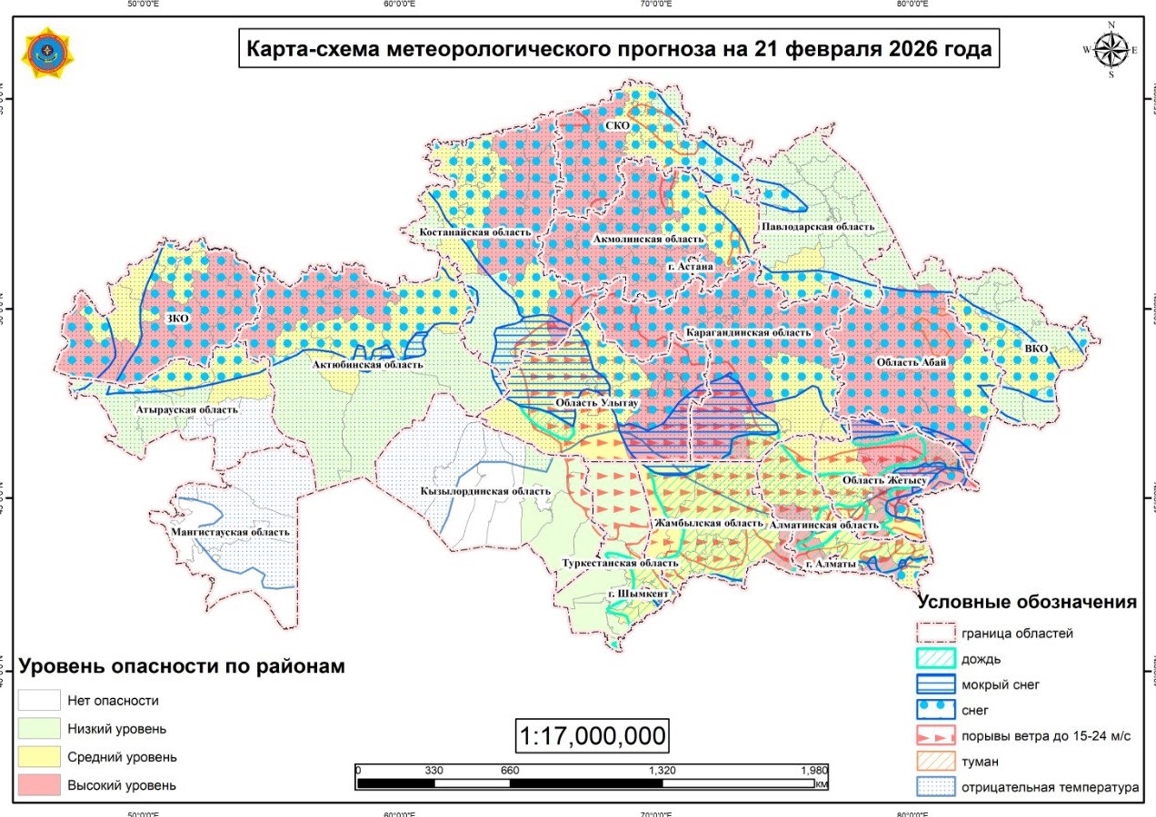 21 ақпанда Түркістан облысы мен Жамбыл облысы аумағында жаңбыр мен қар аралас жауын-шашын жауады. Таулы аудандарда жауын-шашын күшейіп, көктайғақ болуы ықтимал. Желдің екпіні 23-28 м/с-қа дейін жетіп, кей сәттерде 30 м/с-тен асуы мүмкін.