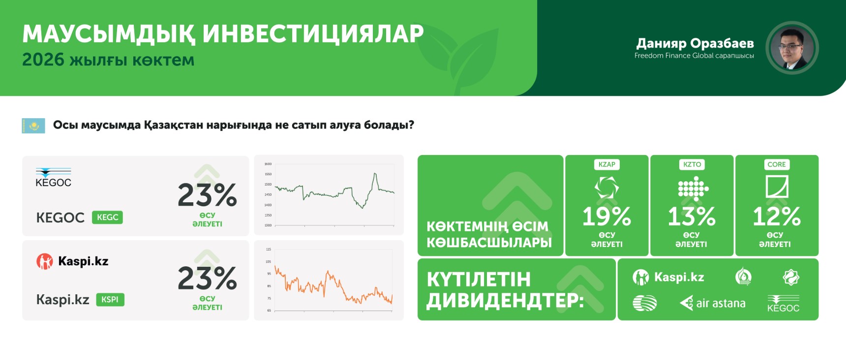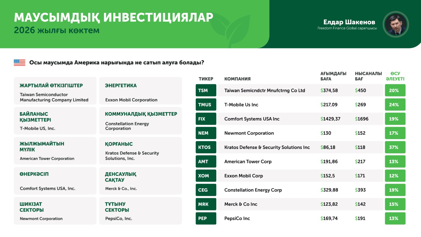 Бірақ тәжірибелі инвесторлар жақсы біледі: дәл осындай кезеңдер жаңа мүмкіндіктерге толы болады. Сарапшылардың айтуынша, 2026 жылдың көктемінде қазақстандық инвесторлар үшін бірден бірнеше бағыт қызықты болуы мүмкін – дивидендтер маусымы, шикізат секторындағы өсім және технологиялық инфрақұрылымға жаһандық инвестициялар.