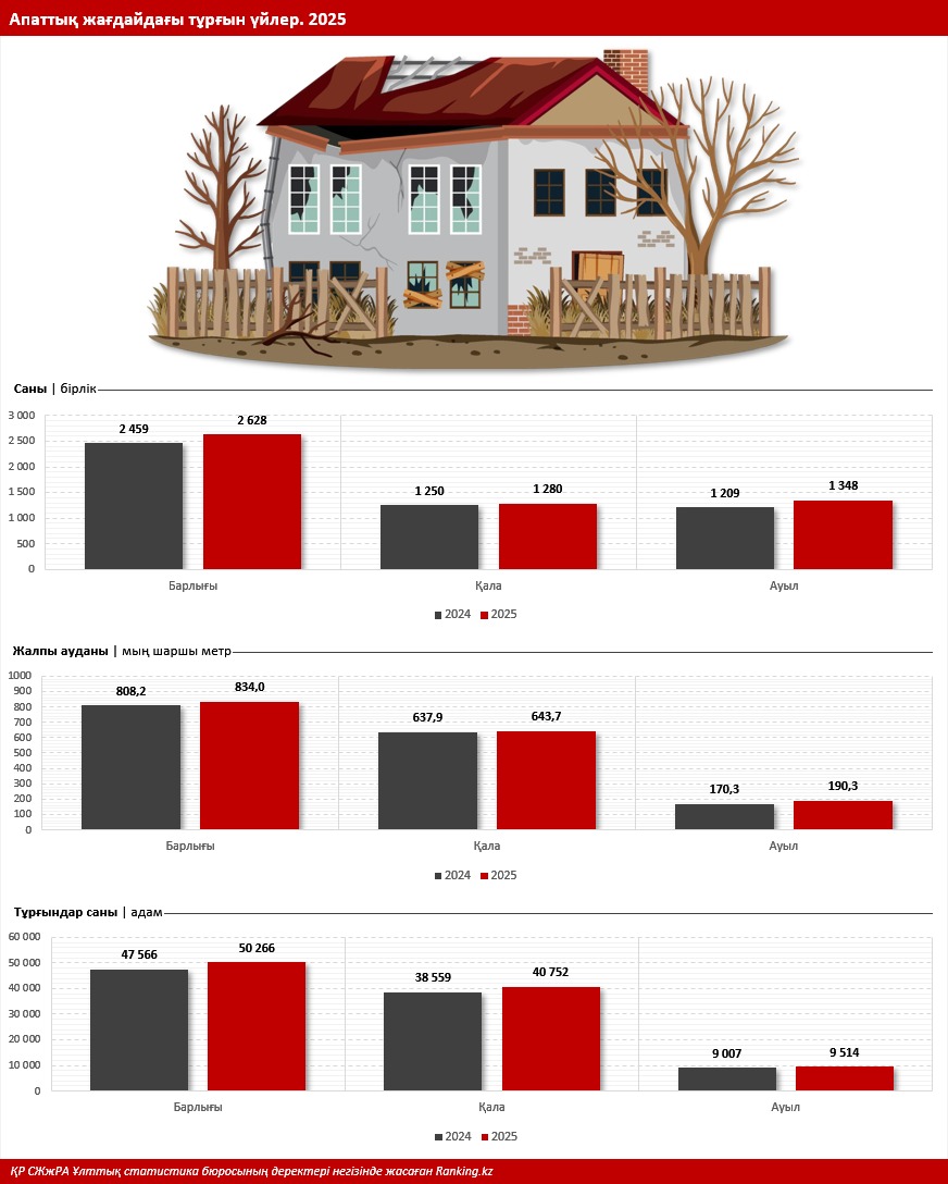 Мәселен, 2025 жылы елімізде апаттық жағдайдағы тұрғын үйлердің саны 7%-ға артып, 2,6 мың бірлікке жетті. Бұл ретте өсім қалалық жерлерде де (плюс 2,4%), ауылдық жерлерде де (плюс 11,5%) байқалды. Апаттық жағдайдағы тұрғын үйлердің жалпы ауданы 3,2%-ға ұлғайып, 834 мың шаршы метрді құрады.