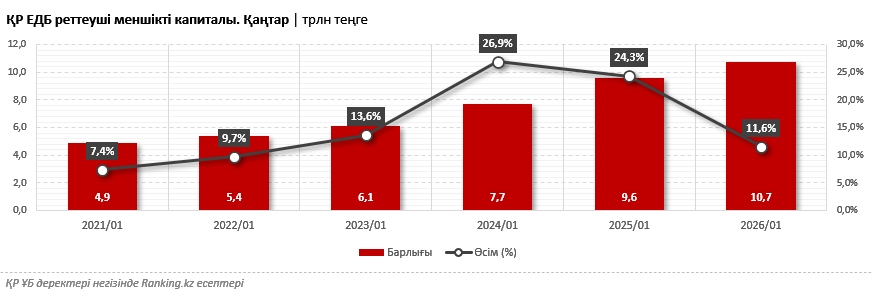 Үстіміздегі жылдың 1 ақпанындағы жағдай бойынша қазақстандық банктердің реттеуші меншікті капиталы 10,7 трлн теңгеге жетті — 2025 жылғы сәйкес кезеңмен салыстырғанда 11,6%-ға көп. Жалпы, соңғы жылдары бұл көрсеткіштің тұрақты өсуі байқалады. Мәселен, соңғы бес жылда ҚР ЕДБ меншікті капиталы жыл сайын орта есеппен 17,2%-ға артып келеді, бұл банк секторының капитал базасын нығайту қарқынының айтарлықтай жоғары екенін көрсетеді.
