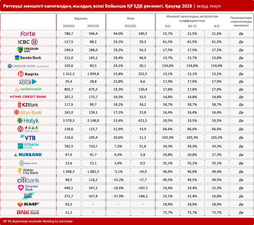 Мәселен, ҚР ЕДБ арасында меншікті капиталдың ең жоғары өсімін ForteBank көрсетті: бір жылда 44%-ға (немесе 240 млрд теңгеге) өсті. Биылғы қаңтар айының соңына қарай банктің меншікті капиталының көлемі 786,7 млрд теңгеге дейін ұлғайды. Сонымен қатар қаржы институтының меншікті капиталының жеткіліктілік көрсеткіштері де жоғары деңгейде тұр. Атап айтқанда, меншікті капитал жеткіліктілігінің k1 коэффициенті — 15,7%, k1-2 — 21,5%, k2 — 21,6%-ды құрады, бұл заңнамада белгіленген нормативтерден айтарлықтай жоғары.