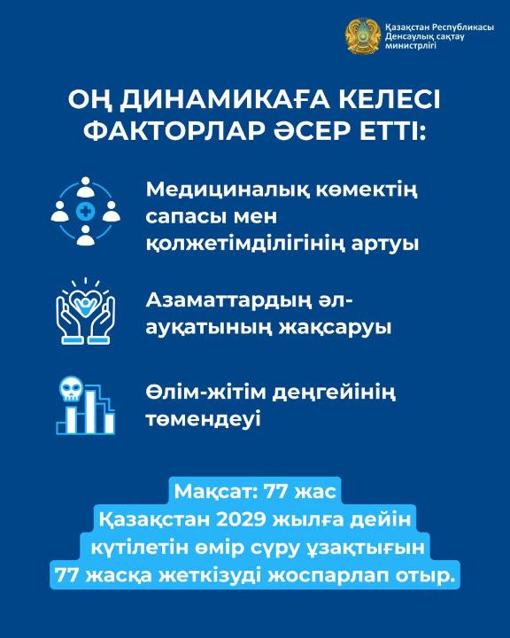 2025 жылдың қорытындысы бойынша күтілетін өмір сүру ұзақтығы 75,97 жасқа жетіп, тәуелсіз Қазақстан тарихындағы ең жоғары көрсеткіш ретінде тіркелді.