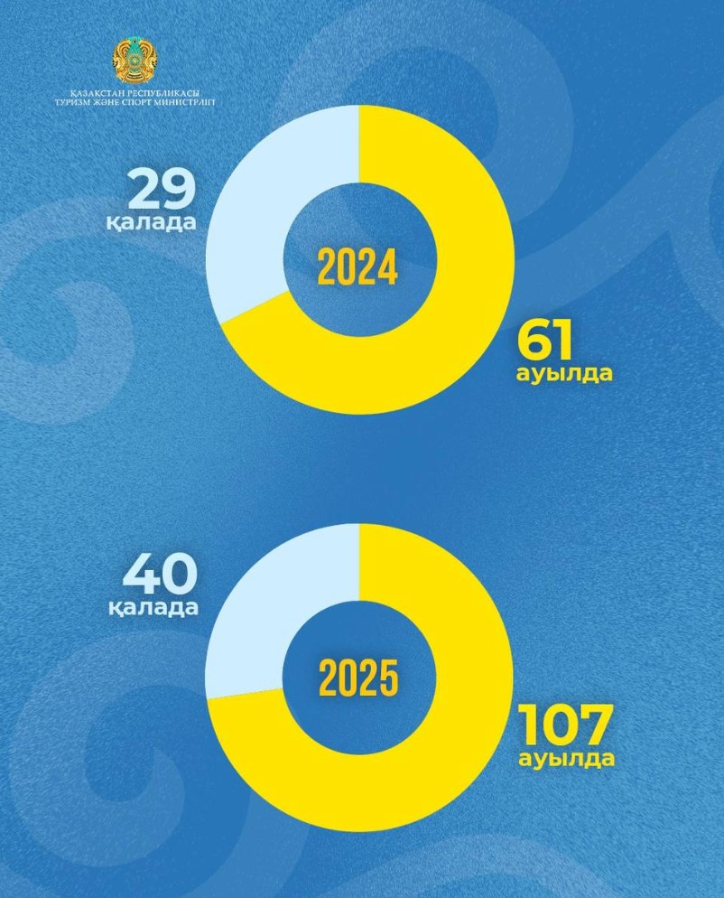 Сандарға қарасақ, өзгеріс айқын көрінеді. 2025 жылы елде пайдалануға берілген 147 спорт нысанының 107-сі ауылдық жерлерде орналасқан. Яғни, әрбір үшінші емес, іс жүзінде басым бөлігі ауылда салынған.