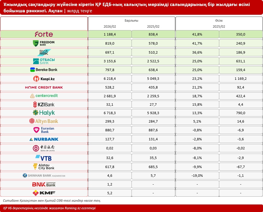 Қазақстандағы барлық ЕДБ арасында халықтың мерзімді салымдарының өсімі бойынша ForteBank көш бастап тұр: бір жылдағы өсім 41,8%-ды немесе 350 млрд теңгені құрады. Ақпан айының соңында банктегі мерзімді депозиттердің көлемі шамамен 1,2 трлн теңгеге жетті.
