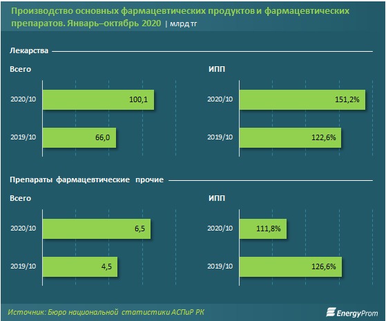 За январь–октябрь 2020 года в стране произвели основных фармацевтических продуктов на 109,6 млрд тг — на 44,7% больше, чем годом ранее, в денежном выражении и на 39,7% — в реальном.
