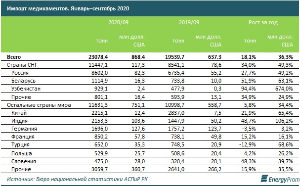 При этом по итогам трёх кварталов в страну завезли 23,1 тыс. тонн медикаментов на сумму 868,4 млн долл. США. Рост в натуральном выражении составил 18,1%, в денежном — сразу 36,3%. Из стран СНГ Казахстан импортировал 11,4 тыс. тонн медикаментов на сумму 117,3 млн долл. США. Основными экспортёрами в РК из стран СНГ стали Россия, Беларусь и Узбекистан. Из остальных стран мира Казахстан импортировал 11,6 тыс. тонн медикаментов на сумму 751,1 млн долл. США. Среди этих стран основными экспортёрами стали Китай, Индия и Германия.