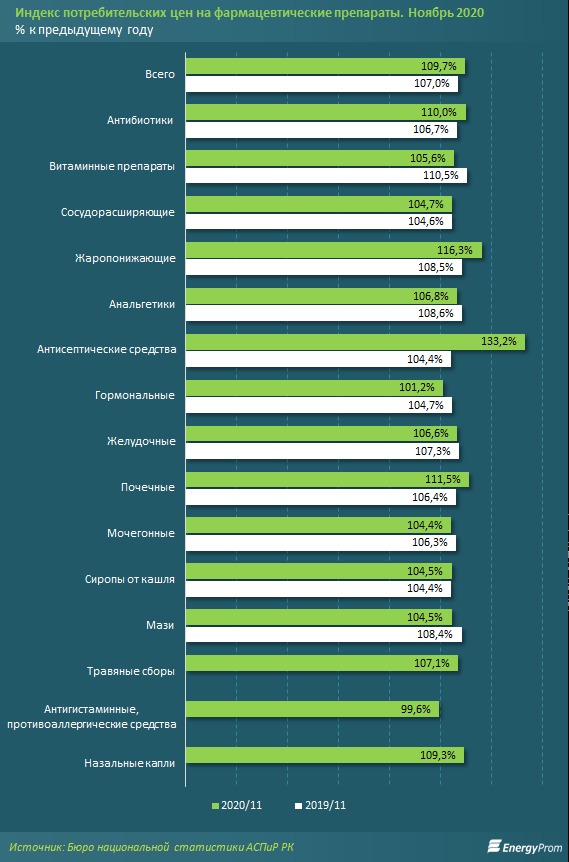 В ноябре 2020 года фармацевтические препараты подорожали на 9,7% по сравнению с ноябрём прошлого года. Среди препаратов значительнее всего выросли в цене антисептические средства (сразу на 33,2%), жаропонижающие (на 16,3%), почечные (на 11,5%), антибиотики (на 10%).