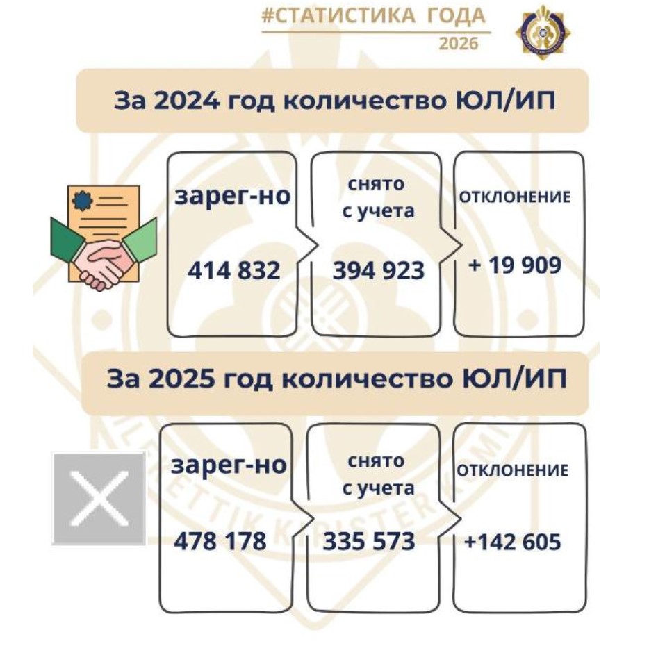 По итогам 2024 года в Казахстане было зарегистрировано 414 тысяч юридических лиц и индивидуальных предпринимателей. За тот же период 394 тысячи ЮЛ и ИП были сняты с учета — по разным причинам: от закрытия бизнеса до смены формата деятельности.