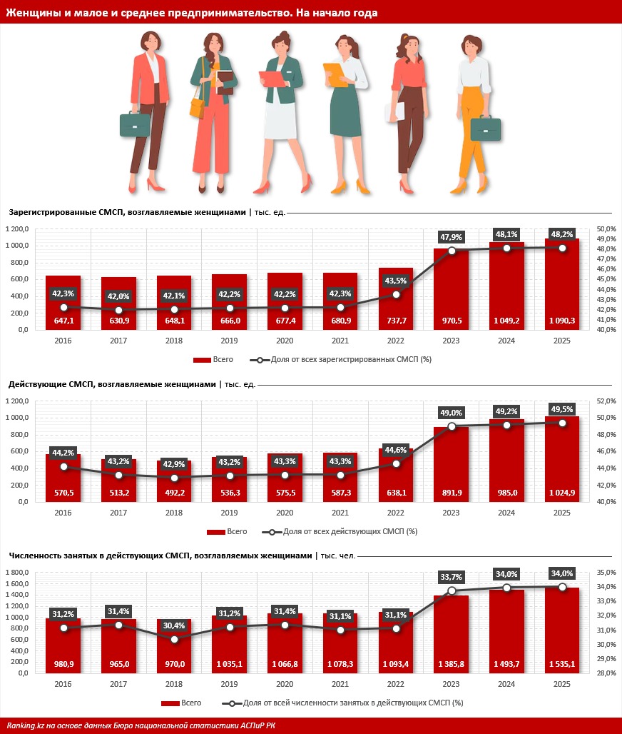 Женщины возглавляют 48,2% всех зарегистрированных субъектов малого и среднего предпринимательства (СМСП) страны (1,1 млн компаний и ИП) и 49,5% действующих (1 млн компаний и ИП). На этих предприятиях работают около 1,5 млн человек, или более трети всех занятых в СМСП. По оценкам разных лет женщины обеспечивают порядка 40% ВВП Казахстана.