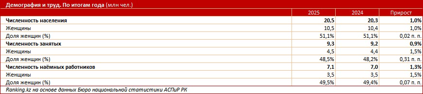 В Казахстане сегодня проживают 10,5 млн женщин, или 51,1% от всего населения страны. Доля женщин среди занятых казахстанцев составляет 48,5% (4,5 млн человек), среди наёмных работников — 49,5% (3,5 млн человек).