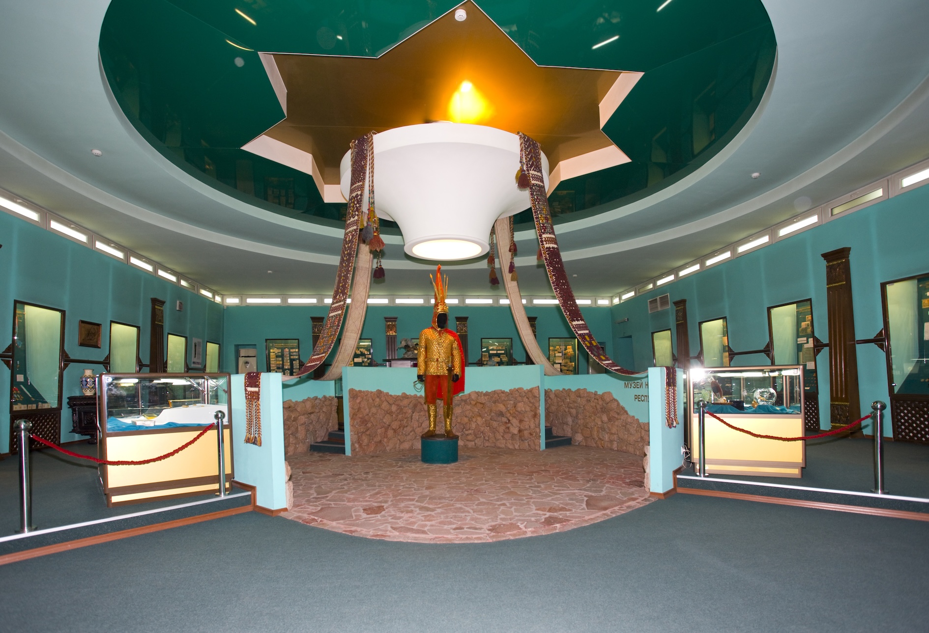 Декоративное оформление пространства вокруг макета также символично: полукруг ограждения напоминает юрту, каменная отделка – курган, а свет, льющийся с купола, символизирует солнечное тепло, доброту и дружелюбие казахского народа.