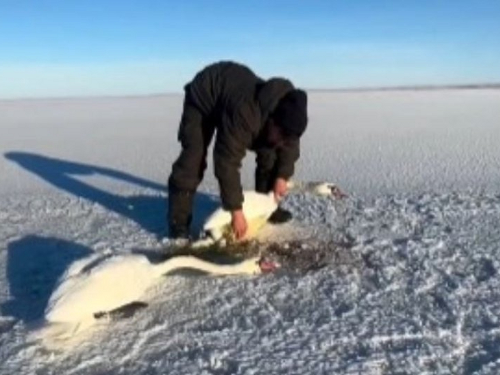 Но на этом история не закончилась. Жакуповы увидели, что на тонком льду сидит еще один лебедь. Бауыржан передвигаясь осторожно, так как лед предательски потрескивал, приблизился к этой птице и понял, что она вмерзла в застывшую воду. Он тут же начал разбивать ее руками и в ладонях растапливать лед на перьях и лапках лебедя.
