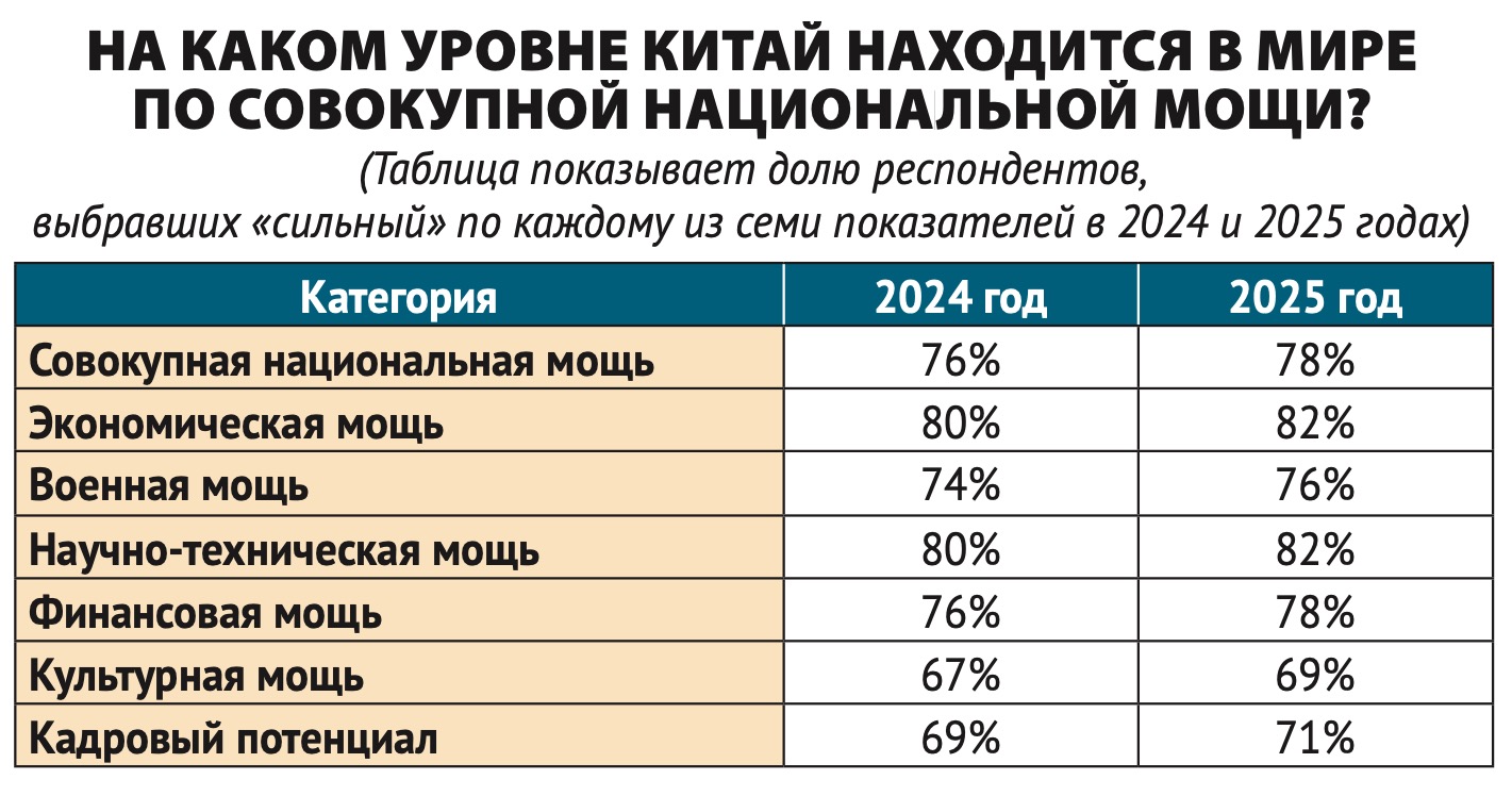 Около 78% считают, что совокупная национальная мощь Китая продолжает расти. В глобальном рейтинге международного влияния Китай в среднем занимает второе место, при этом доля тех, кто ставит Китай на первое место, увеличилась, а позиции США, напротив, ослабли.