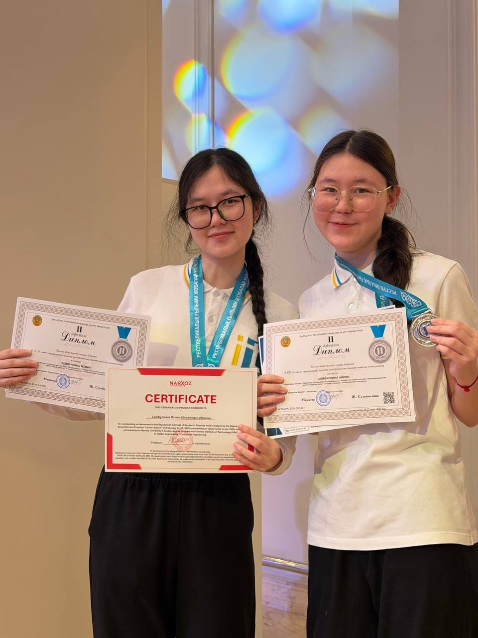 Инновационный проект сестер Сейфуллиных из Карагандинской области оказался среди призеров республиканского конкурса научных проектов в Астане. Строгое жюри присудило им второе место. По результатам конкурса одна из участниц команды получила 100% грант на обучение в Университете Нархоз по программе двойного диплома с Illinois Institute of Technology (Чикаго, США), который давали всего семерым участникам из 623 школьников со всего Казахстана.