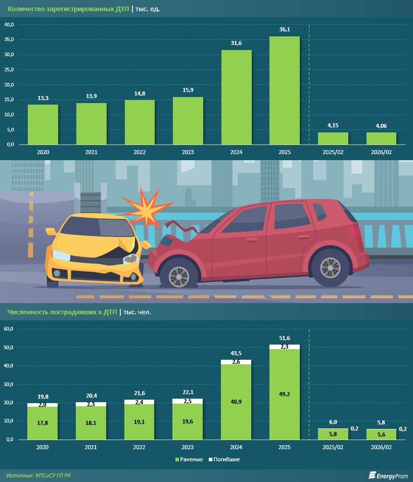 Помесячные данные за февраль 2025 и 2026 годов свидетельствуют о сохранении тенденции: за первые два месяца текущего года на казахстанских дорогах 5,6 тыс. человек были травмированы, 222 человека погибли.