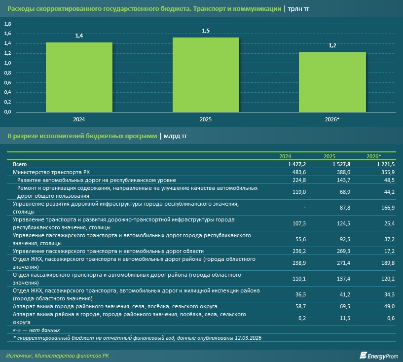 Мы проанализировали данные Министерства финансов РК по расходам государственного бюджета на автомобильный транспорт за три года, с 2024-го по 2026-й. Информация за текущий год дана по скорректированному госбюджету, опубликованному 12 марта. Анализ отчётов ведомства подтверждает опасения мажилисменов: объём поступлений из бюджета на ремонт и содержание дорог действительно не имеет чёткой последовательной системы и зависит от бюджетных циклов. Если в прошлом году скорректированный бюджет на развитие автомобильного транспорта в сравнении с 2024-м вырос на 7%, превысив 1,5 трлн тг, то согласно проекту 2026 года этот прогнозный показатель сократился на 20%. На строительство и ремонт дорог разного уровня в текущем году выделено всего 1,2 трлн тг. Напомним: пока это только проект скорректированного бюджета, итоговая потраченная сумма будет известна в конце года.