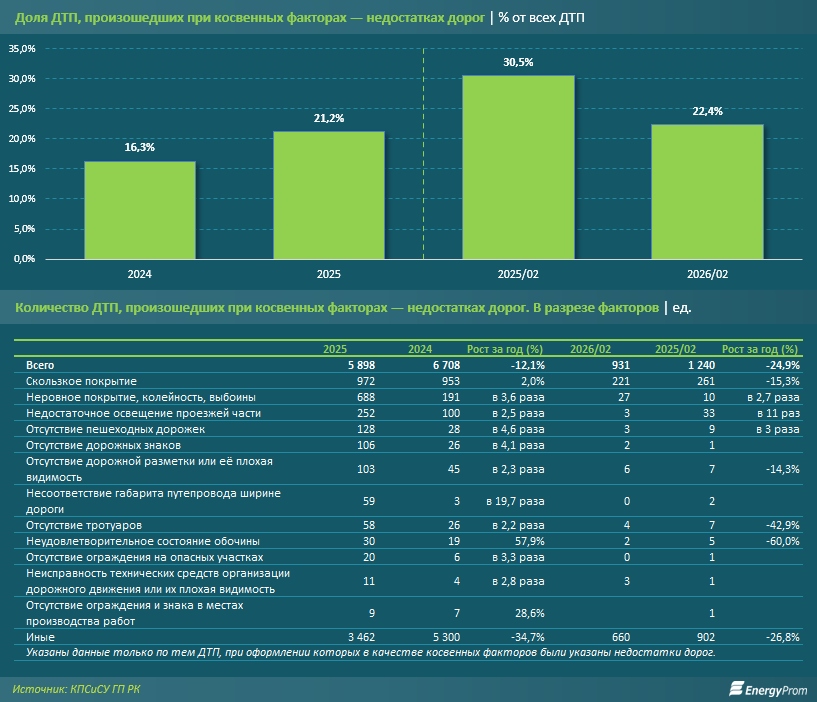 Много аварий в казахстанских городах и на загородных трассах происходит из-за неровного покрытия, колейности и выбоин на дорогах. Статистика ДТП, произошедших при таком косвенном факторе, за 2025-й показала рост почти в 4 раза, за два месяца текущего года — в 2,7 раза. Помимо этого, по итогам прошлого года существенно увеличилось количество аварий из-за недостаточного освещения проезжей части (в 2,5 раза), отсутствия пешеходных дорожек (в 4,6 раза). Эти данные подчёркивают критический уровень износа дорожной инфраструктуры в отдельных районах и необходимость срочного ремонта дорог, улучшения освещения и обустройства пешеходной инфраструктуры.