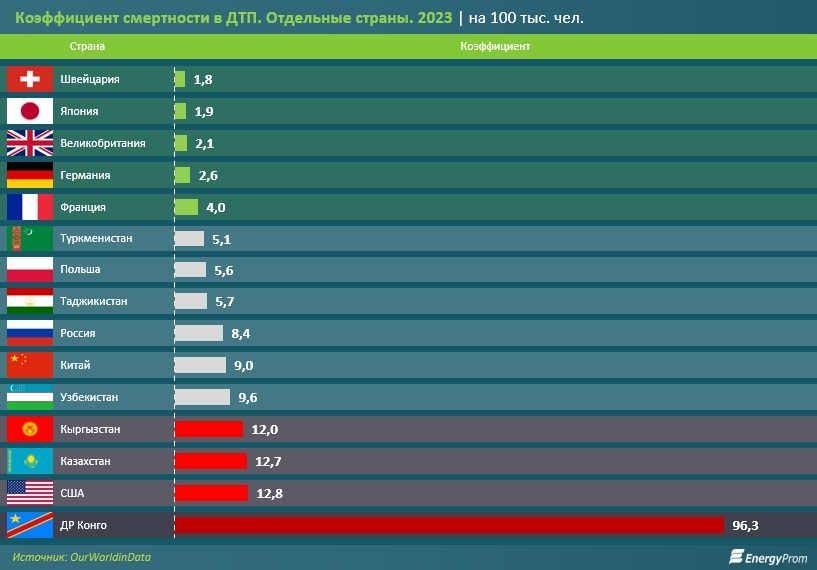 Скажем прямо: по коэффициенту смертности на дорогах РК является антилидером среди стран Центральной Азии, соседних государств. Наилучший показатель в ЦА в 2023 году принадлежал Туркменистану: всего 5,1 на 100 тыс. населения. В Таджикистане индикатор также был небольшим: 5,7. В России он составлял 8,4 на 100 тыс. человек.
