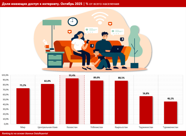 Медианная скорость мобильного интернета в ноябре 2025 года в Казахстане, по данным Ookla, достигала 93,1 Мбит в сек., что является самым высоким показателем в ЦА и незначительно уступает среднемировому значению (103 Мбит в сек.). В Узбекистане медианная скорость мобильного интернета составляла 53,2 Мбит в сек., в Кыргызстане — 51,6 Мбит в сек. По Таджикистану и Туркменистану данные отсутствуют.