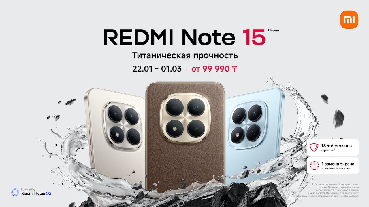 22 января 2026 года Xiaomi Казахстан объявила о запуске серии REDMI Note 15, в которую вошли четыре модели: REDMI Note 15 Pro+ 5G, REDMI Note 15 Pro 5G, REDMI Note 15 Pro и REDMI Note 15. Новая линейка сочетает усиленную надёжность конструкции, длительное время автономной работы, расширенную пыле- и влагозащиту, а также продвинутые фотовозможности и высокую производительность в среднем ценовом сегменте.