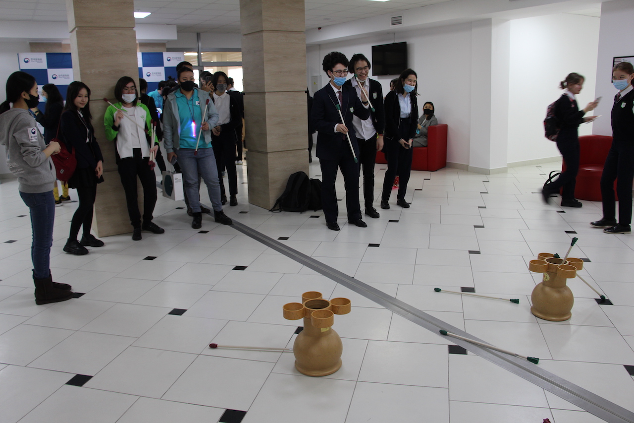 У ребят также была возможность принять участие в корейской традиционной игре «тухо». Участникам, которые при 10 бросках не менее 3 раз смогли попасть стрелой в глиняный горшок, были вручены в подарок кольца-держатели для смартфона с логотипом Центра. Ученики проявили большой интерес к традиционным корейским играм и сувенирам Центра, по несколько раз участвуя в состязаниях.
