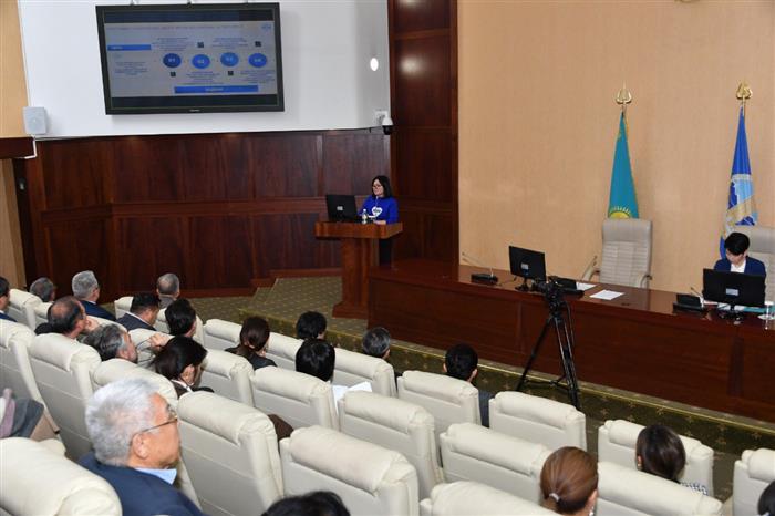 Основными докладчиками выступили член-правления по операционной деятельности КазНУ – проректор Асель Увалиева, заместитель директора департамента по развитию IT-инфраструктуры Галымжан Сариев.