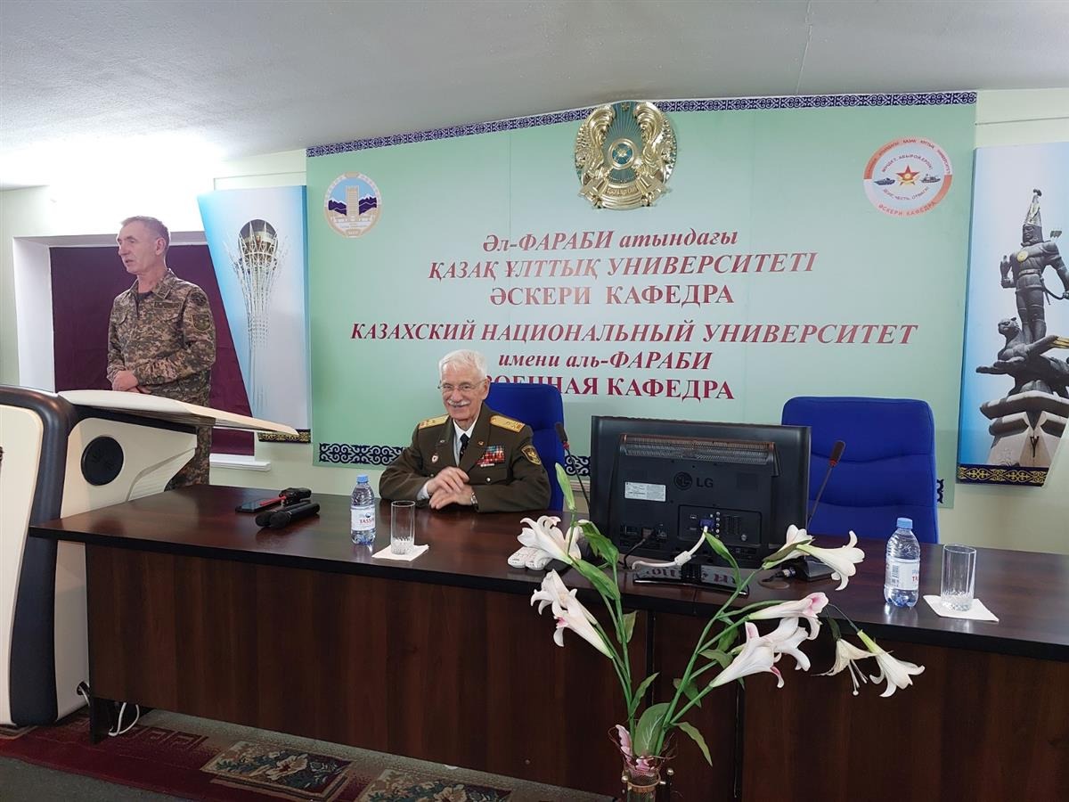 В заключение мероприятия начальник военной кафедры КазНУ имени аль-Фараби полковник запаса О.В. Ажимов от имени коллектива и студентов поздравил полковника в отставке К.В. Мамсурова с наступающими праздниками Днем Защитника Отечества и Днем Победы и поблагодарил за плодотворное сотрудничество в деле военно-патриотического воспитания студенческой молодежи.