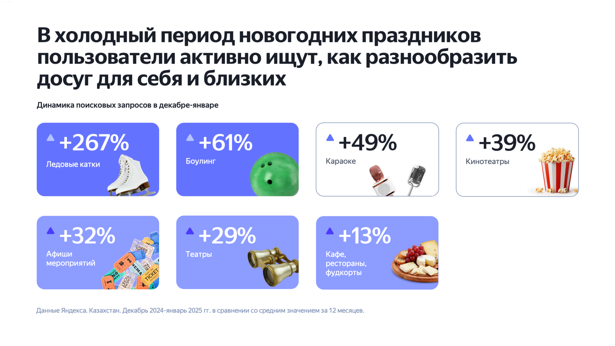 В декабре-январе люди активно ищут, как разнообразить свой и досуг своих близких. В 3,7 раза растут запросы про ледовые катки, на 61% — про боулинг, на 49% — про караоке.