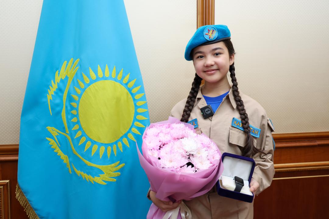 По возвращении в Астану с важным событием двенадцатилетнюю Жасмину Тузелову поздравил руководитель оборонного ведомства генерал-лейтенант авиации Даурен Косанов.