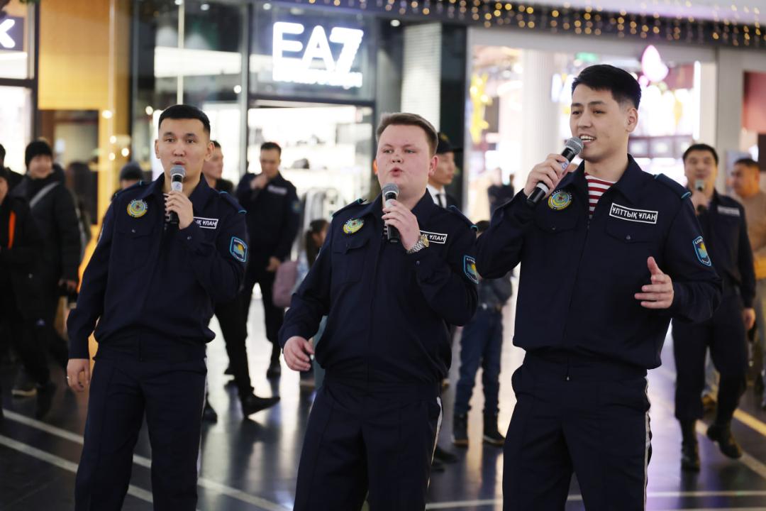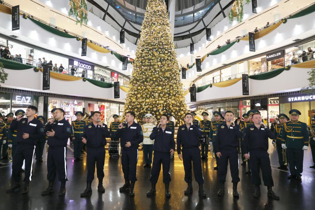 Неожиданно для посетителей ТРЦ гвардейцы в форме исполнили всеми любимые новогодние мелодии. В праздничном перформансе приняли участие мужской хор и образцово-показательный оркестр Национальной гвардии МВД РК. В зале прозвучали такие известные композиции, как Jingle Bells, Happy New Year на казахском языке, тепло встреченные зрителями.