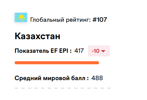 в отчёте EF EPI 2024 Казахстан занимал 103-е место из 116. Формально изменение позиции частично связано с расширением списка стран, однако более тревожный сигнал — падение общего балла сразу на 10 пунктов, что говорит о реальном снижении языковой подготовки.