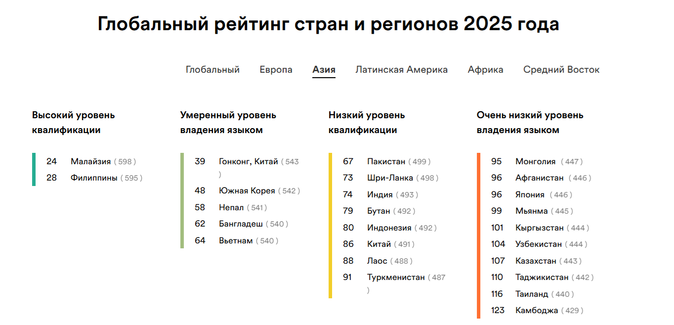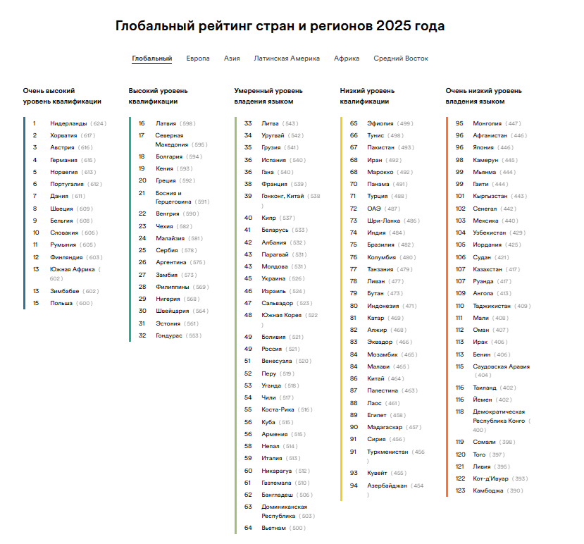 В рейтинге EF EPI 2025 Казахстан занял 107-е место из 123 стран и регионов. Страна остаётся в категории «очень низкий уровень владения английским языком», набрав 417 баллов при среднем мировом показателе 488.