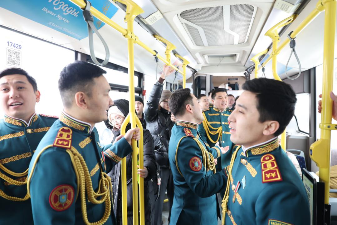 В преддверии Международного женского дня солисты мужского хора Ансамбля Национальной гвардии МВД Казахстана провели праздничную акцию для жительниц и гостей Астаны. Музыкальные выступления прошли прямо в городских автобусах, а также на территории вокзального комплекса «Нұрлы жол», передает DKNews.kz.